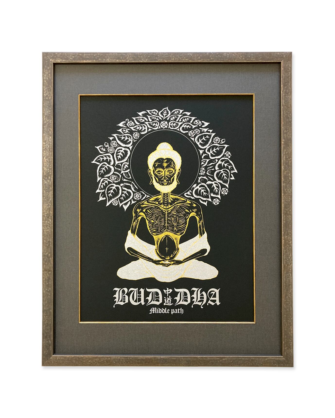 幽玄な雰囲気をまといながら、金と銀のシルクスクリーン印刷が仏陀の存在感と静けさを際立たせています。