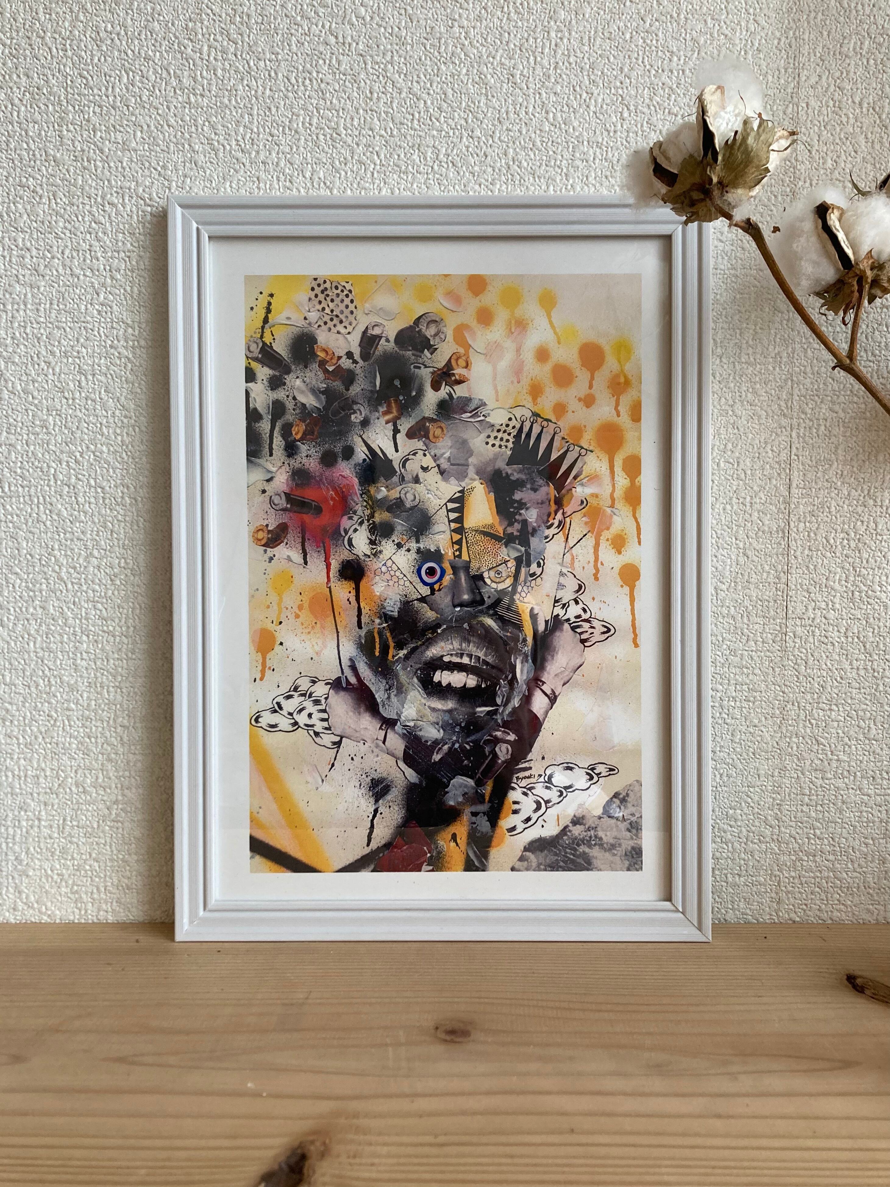 コラージュアートのクールな雰囲気がカッコいい額装入り立て掛け用ポスターです。