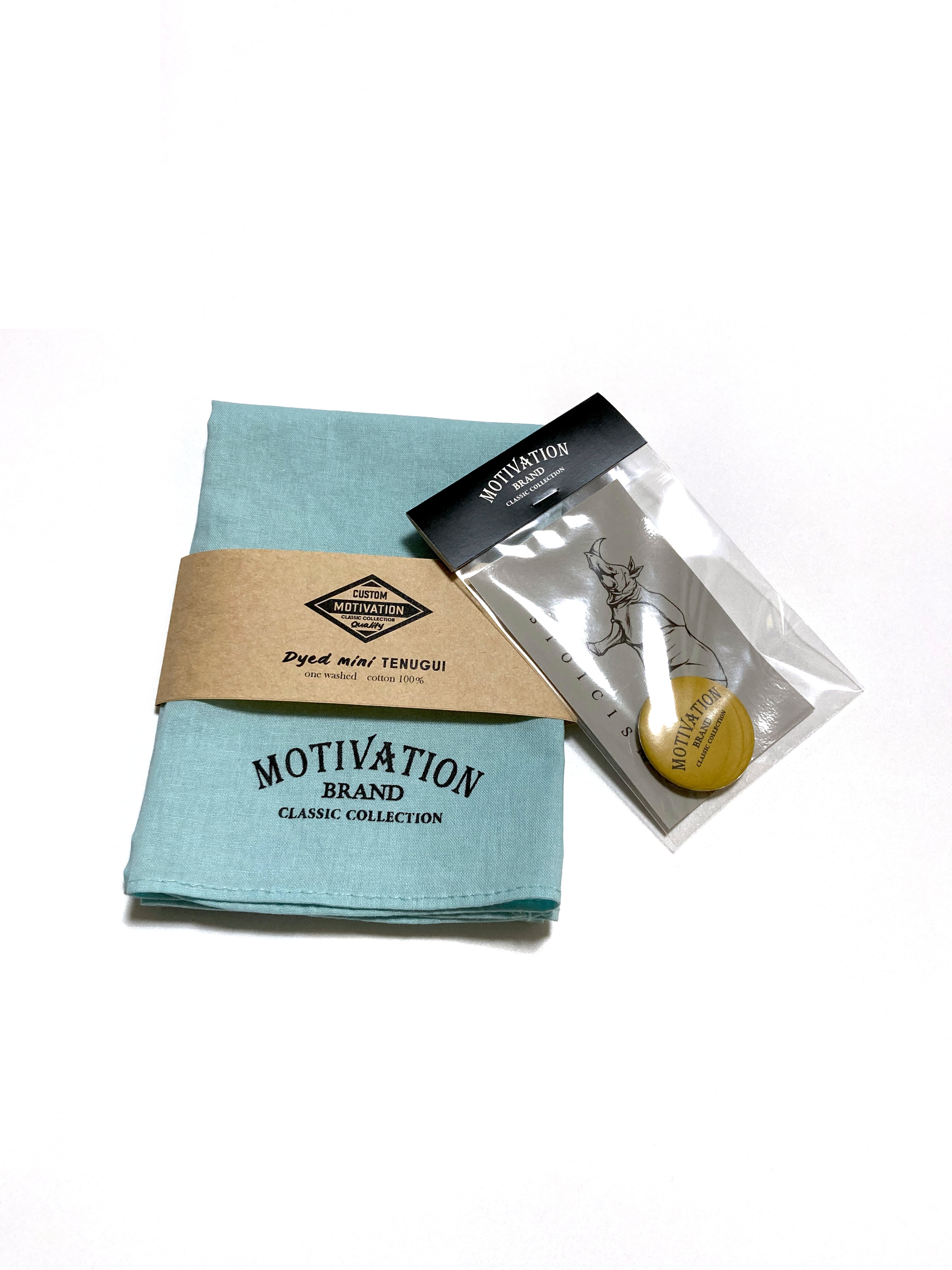 ミニ手拭いとステッカー缶バッヂが付いています。